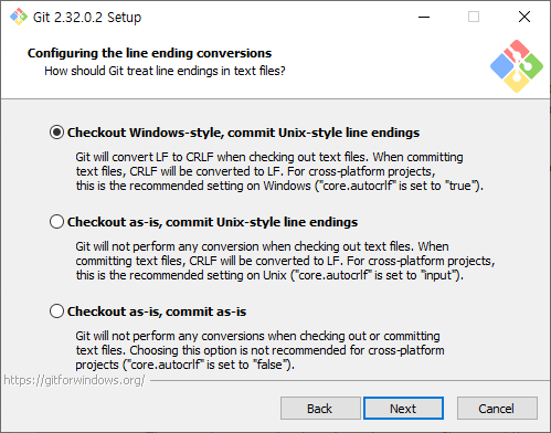 첫번째 옵션은 윈도우로 코드를 가져올때 CRLF (윈도우) 형태로 변환하고, 커밋할때 LF (유닉스) 형태로 변환해서 전송한다.