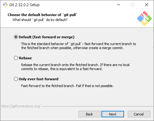 최신 코드로 업데이트하는 git pull 명령 했을 때의 코드 병합 (Merge) 정책을 결정한다. Default를 사용한다.