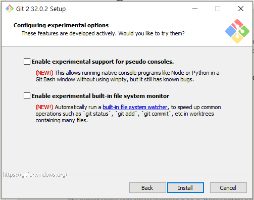 실험적인 옵션 선택인데 선택하지 않았다. git의 신규 기능을 체험해 볼 수 있는 옵션이다.