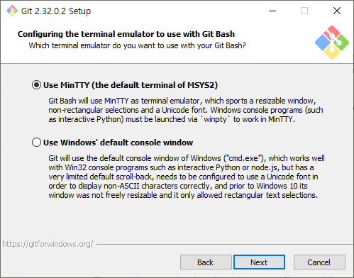 터미널 에뮬레이터를 선택한다. Use MinTTY를 선택했다.