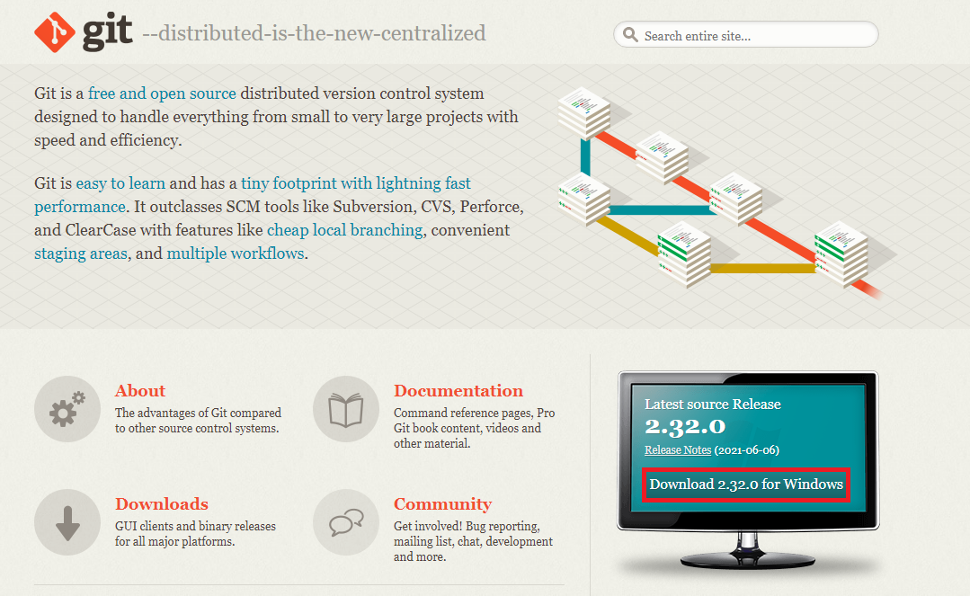 우측 하단의 'Download 2.32.0 for Windows'를 클릭하고 설치 파일을 다운로드한다. 현재 2.32.0 버전이 최신 버전이다.