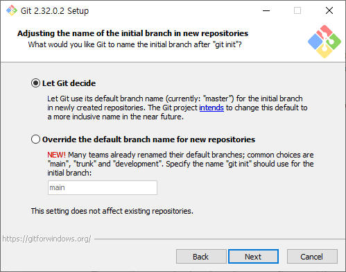 git init 명령 수행시 생성하는 초기 브랜치 이름을 결정한다. Let Git decide를 선택했다.