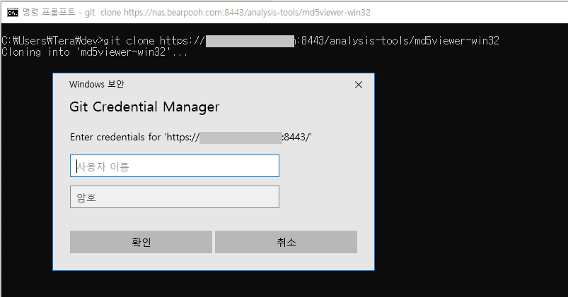gitlab의 코드를 clone한다. 아까 선택한 Git Credential Manager가 실행되면서 계정 정보 입력을 요구한다.