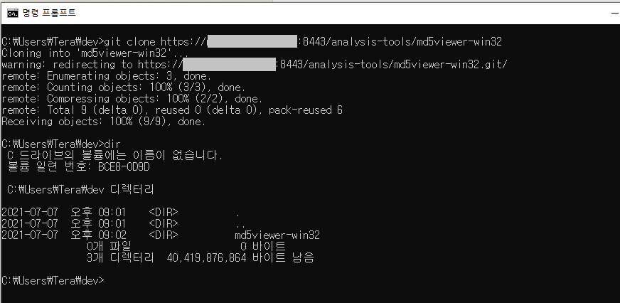 계정 정보 인증에 성공하면 코드 복제가 진행된다. 정상적으로 폴더가 생성된 것도 확인된다.