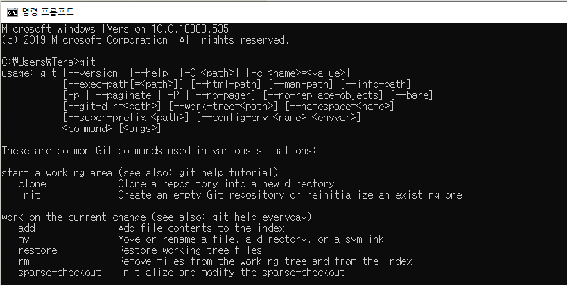 cmd 창을 띄워서 git 명령을 실행하면 정상적으로 실행된다.