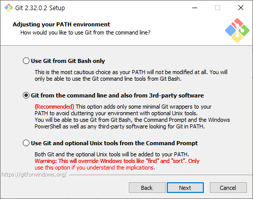 git을 설치하면 유닉스의 bash 명령어들을 사용할 수 있는데, 세번째 옵션을 선택하면 Git Bash 뿐 아니라 cmd에서도 가능하다.