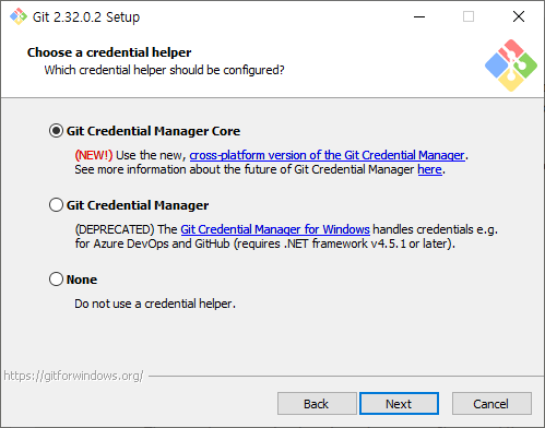 git 원격 저장소에 접근할 인증 도구를 선택한다. 기본값인 Git Credential Manager Core를 사용한다.