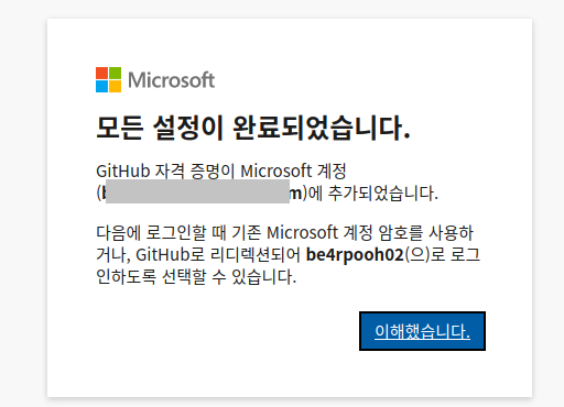 Microsoft 계정과 GitHub 계정의 연결을 안내하는 메시지로 '다음' 버튼을 클릭한다.