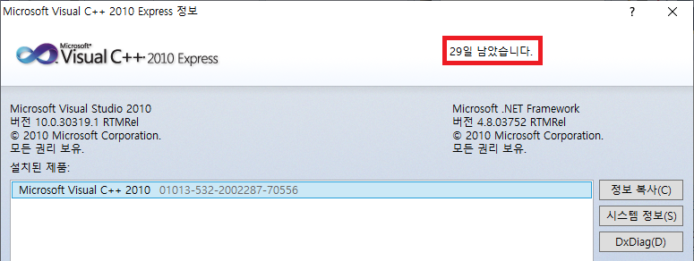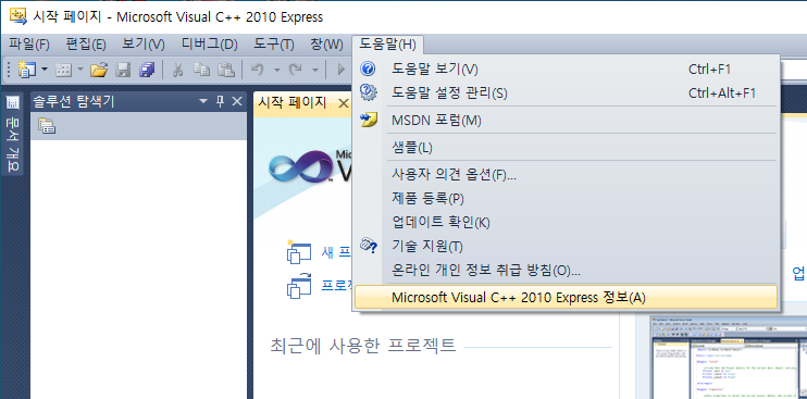 다시 메뉴 우측의 '도움말(H)' - 'Microsoft Visual C++ 2010 Express 정보(A)'를 클릭한다.