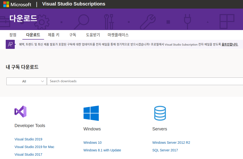 로그인에 성공하면 다음과 같은 MDSN 다운로드 사이트로 연결된다.