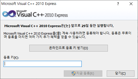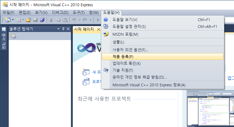 Visual C++ 2010 Express 상단 메뉴 우측의 '도움말(H)' - '제품 등록(P)'를 클릭한다.