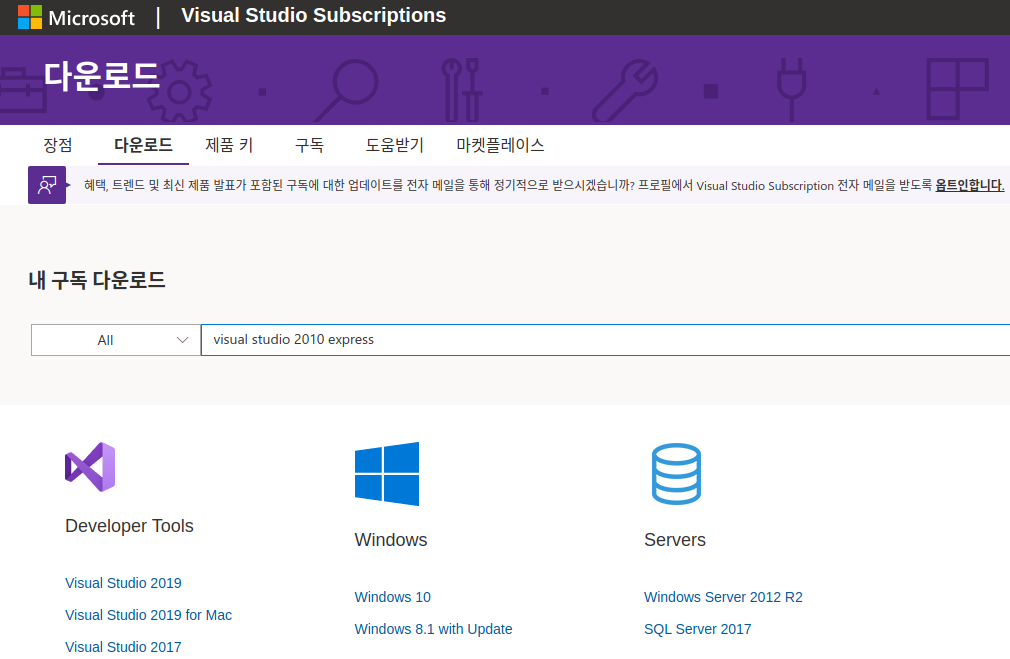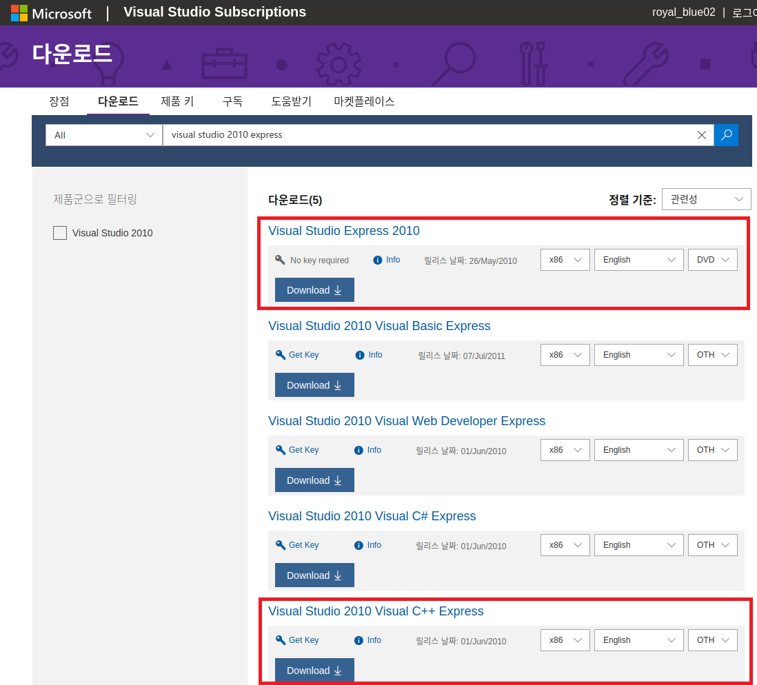 검색 창에 visual studio 2010 express를 입력하고 검색한다.