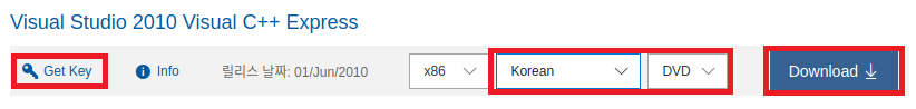 Visual C++만 사용할 예정이므로 하단의 Visual Studio 2010 Visual C++ Express 를 사용한다.
