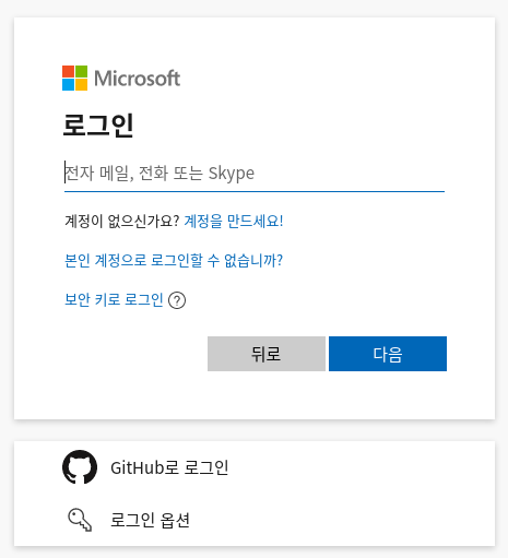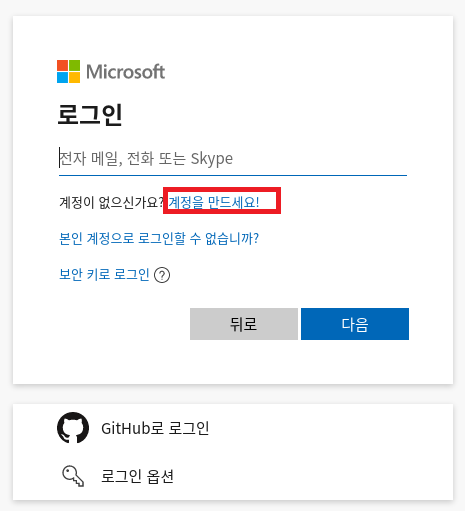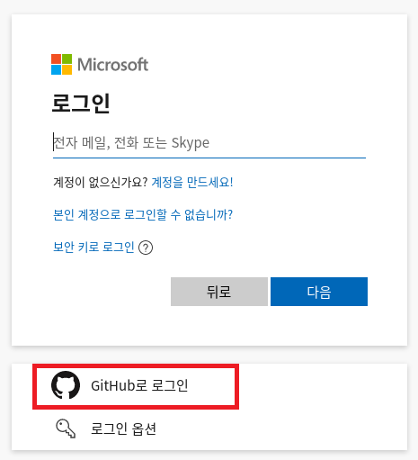 Microsoft에 계정이 없는 경우에는 GitHub 계정을 사용하거나 계정을 생성해야 한다.