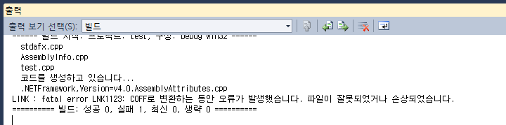 'LINK : fatal error LNK1123: COFF로 변환하는 동안 오류가 발생했습니다.'