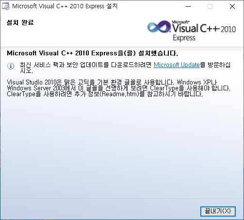 재부팅 이후 Visual C++ Express 2010을 실행하고 다시 빌드를 진행하면 정상적으로 빌드된다.