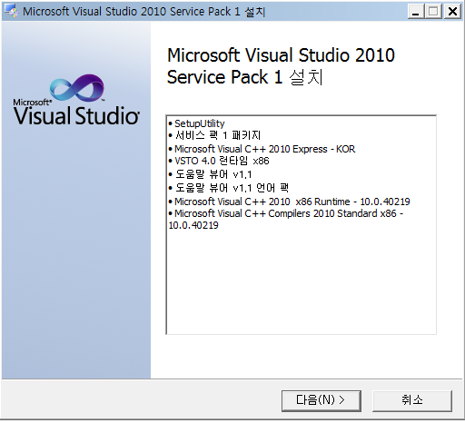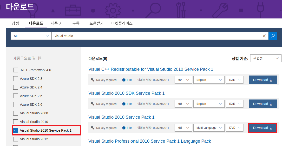 - MDSN에서 Visual Studio로 검색하고 왼쪽에서 Visual Studio 2010 Service Pack 1에 체크한다.