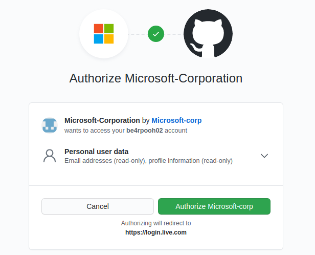 Microsoft 계정과 GitHub 계정을 연동하는 화면이다. 'Authorize Microsoft-corp' 버튼을 클릭한다.