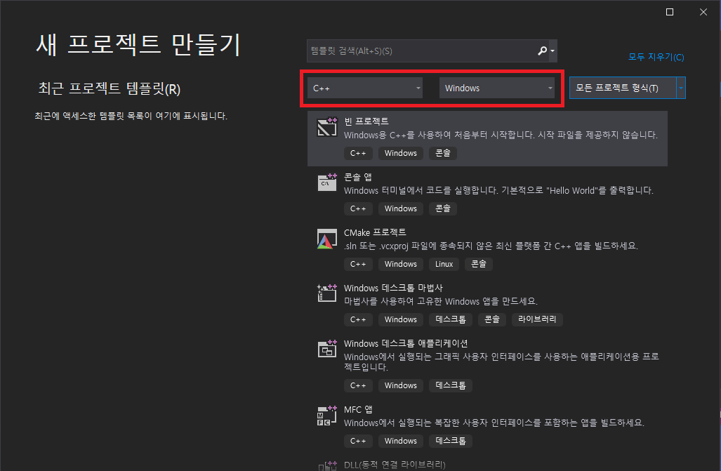 C++과 Windows를 선택하면 생성 가능한 프로젝트 템플릿이 표시 된다. MFC도 있다.