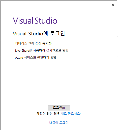 실행하면 로그인 화면이 출력되는데, 로그인 버튼을 눌러 Microsoft 계정으로 로그인한다.
