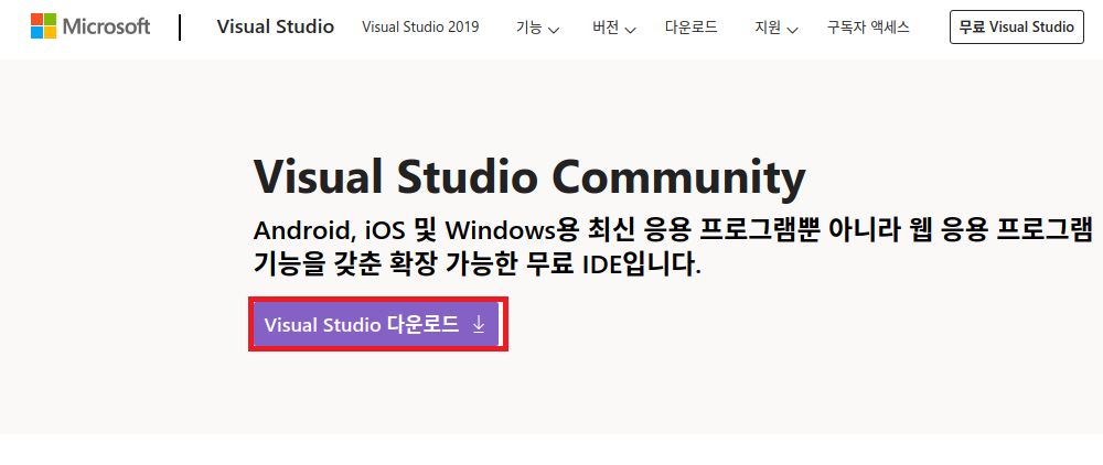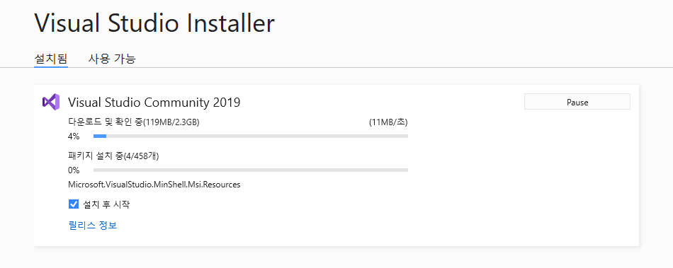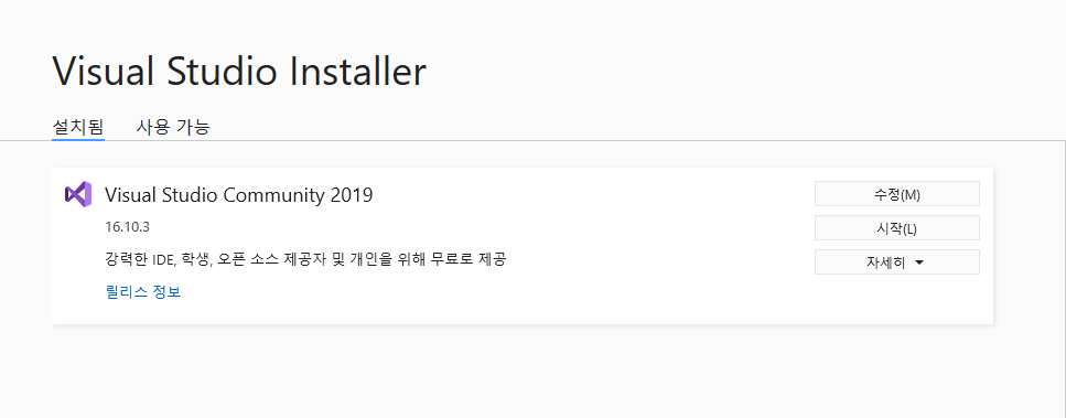 정상적으로 Visual Studio Community 2019가 실행된 것을 확인할 수 있다.