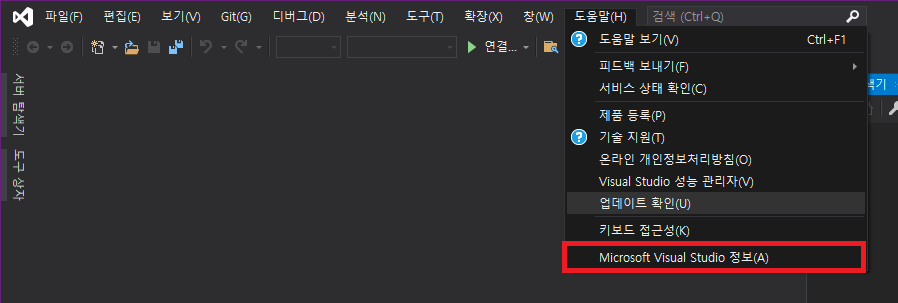 메뉴 상단의 '도움말(H)' - 'Microsoft Visual Studio 정보(A)' 메뉴를 클릭한다.