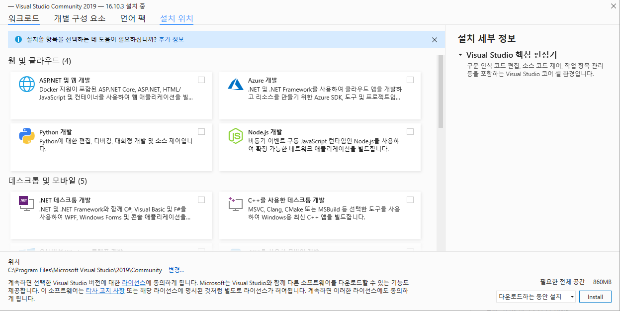 막상 설치하고 보니 좋다. 그런데 용량을 많이 차지하고 무겁다. 파이썬과 C++ 개발도구만 선택해도 10G를 차지한다.