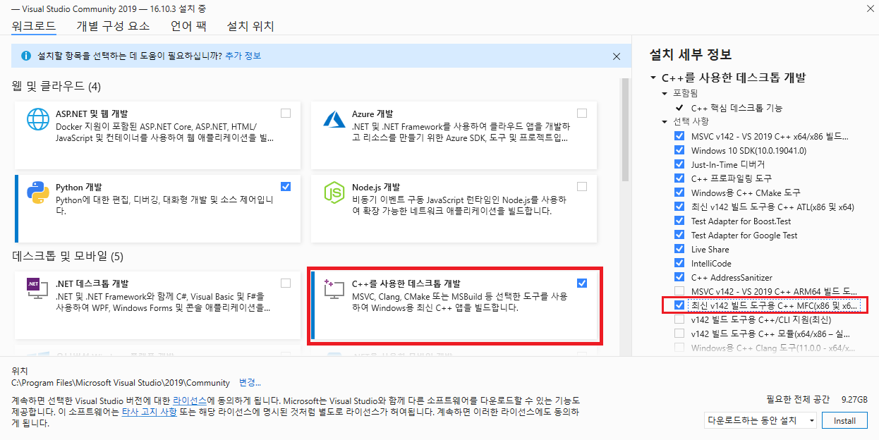Python과 C/C++ 개발 옵션만 선택했는데도 9.27 GB를 차지한다.