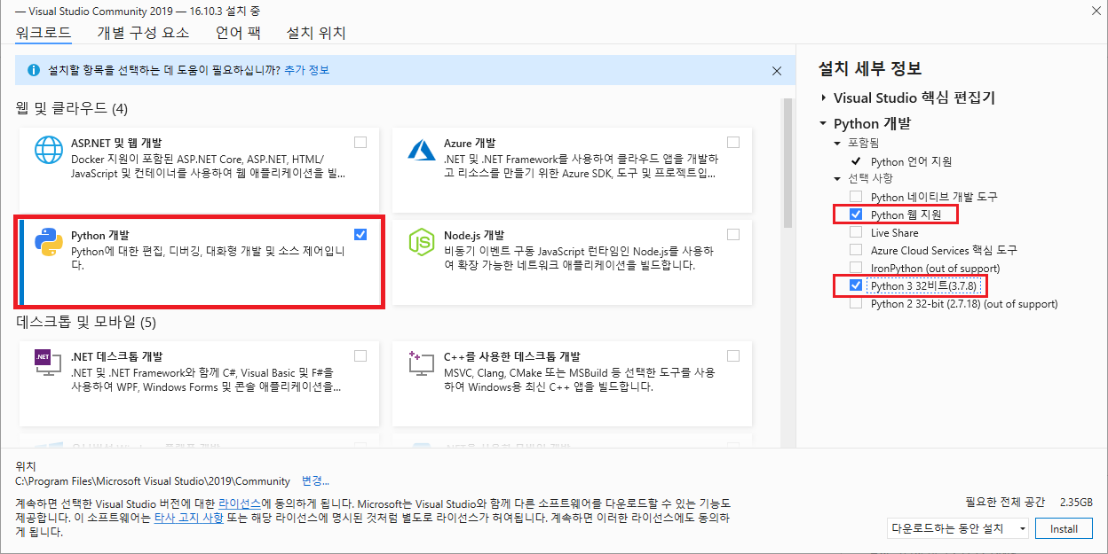 세부 구성 사항에 Python 3, Python 웹 지원을 선택한다.