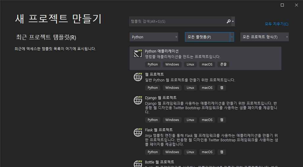 파이썬과 모든 플랫폼을 선택하면 가능한 프로젝트 템플릿이 표시된다.