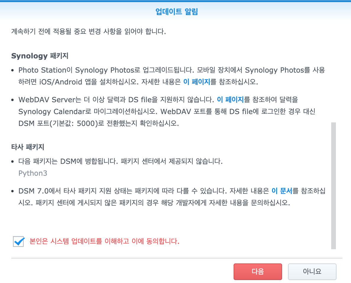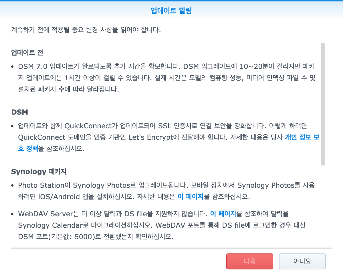 자세한 사항은 시놀로지의 공지사항을 참고한다. 구버전의 경우 알림이 뜨지 않는 경우도 있다.