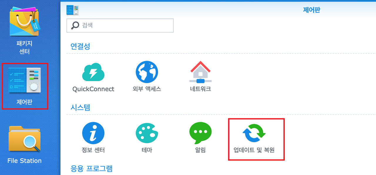 드디어 변경된 바탕화면이다. 더 깔끔해졌다. 반응 속도도 조금 더 나아진 것 같다. 패키지 센터에 업데이트를 의미하는 빨간 동그라미가 표시되어 있다.