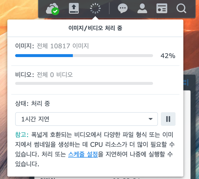 신규 업데이트 되면서 사진과 동영상에 대한 인덱싱을 다시 진행한다. 썸네일을 새로 만들고 인덱스를 새로 생성하는데, 파일이 많을수록 오래걸린다. (DS220+에서 약 20~30분 걸린것 같다. 사진 5만장, 동영상 1000개 정도..)