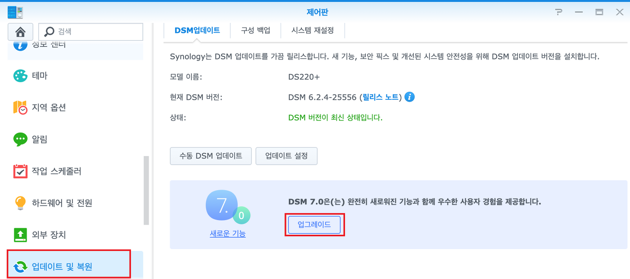 DS220+와 DS213에서 관리 화면인 DSM (Disk Station Manager)을 6.2.3-25556 버전으로 사용하고 있었다. 사실 7.0 버전에 대한 관심은 없었는데 최근에 7.0 버전이 정식 배포되었다.