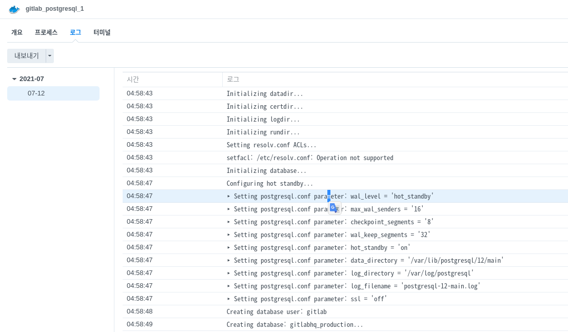 NAS의 Docker 앱에서 gitlab_postgresql_1 컨테이너의 로그를 확인해보면 정상적으로 실행되는 것이 확인된다.