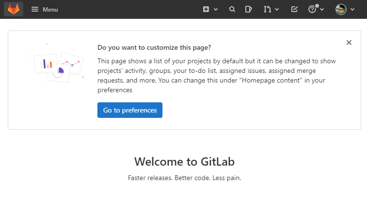 로그인이 완료되면 초기 화면이 출력된다. gitlab 설치가 완료되었다!