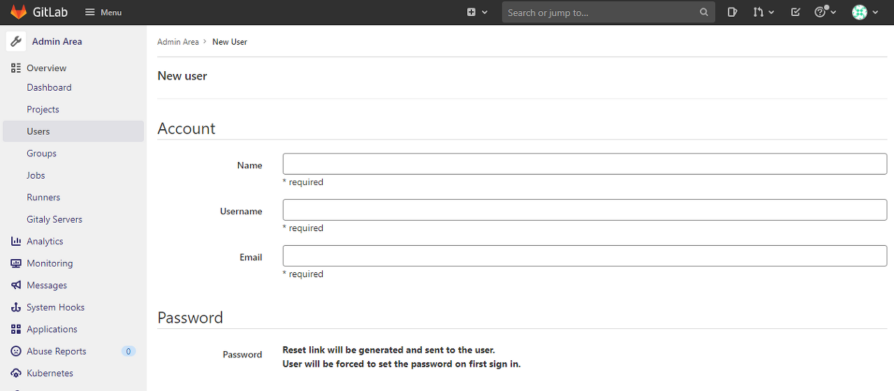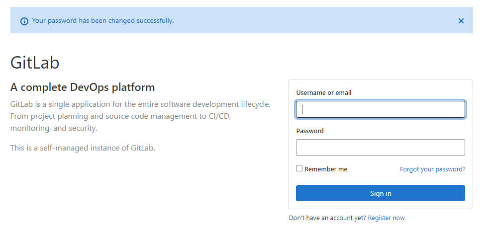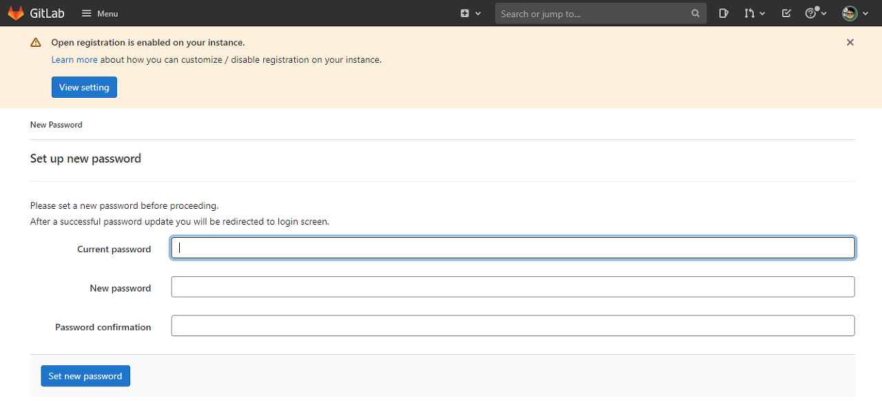 gitlab에 접속해보면 패스워드 변경 화면이 확인된다. root 계정의 비밀번호를 수정한다.