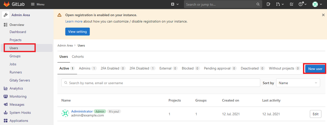 Users를 클릭하고, 우측 끝 부분의 New user 버튼을 클릭한다.