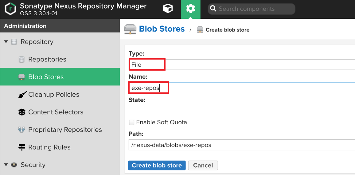 - Name은 사용할 Blob Store 이름을 지정한다. exe-repos로 지정했다.