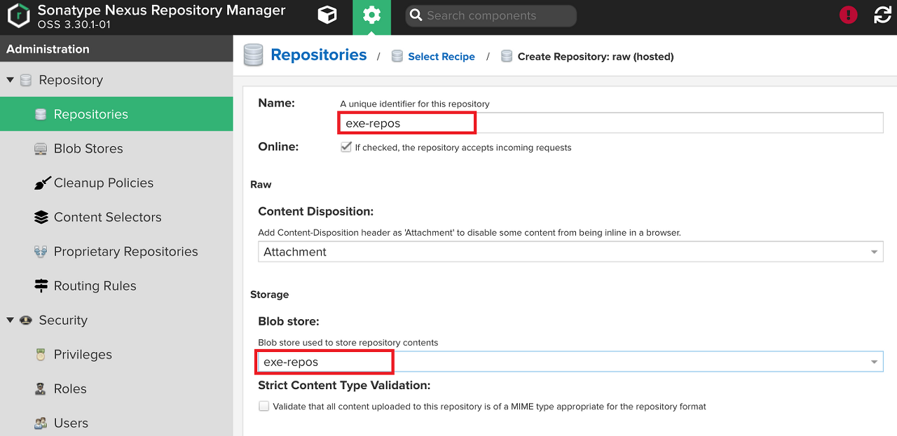- Name은 Blob Store의 이름과 동일하게 exe-repos로 지정했다.