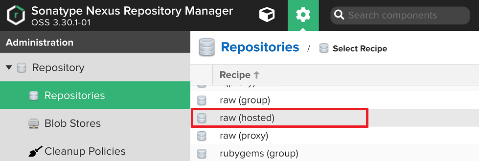 관리자 페이지의 Repositories를 클릭하고 raw (hosted)를 선택한다.