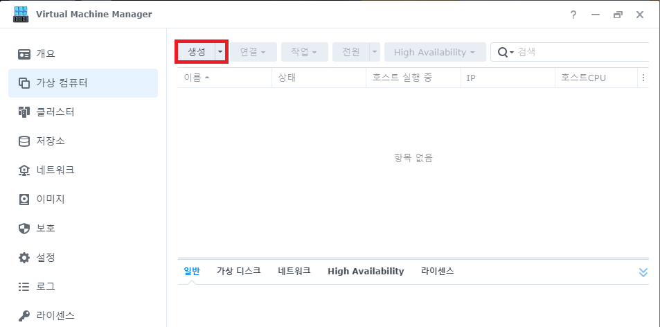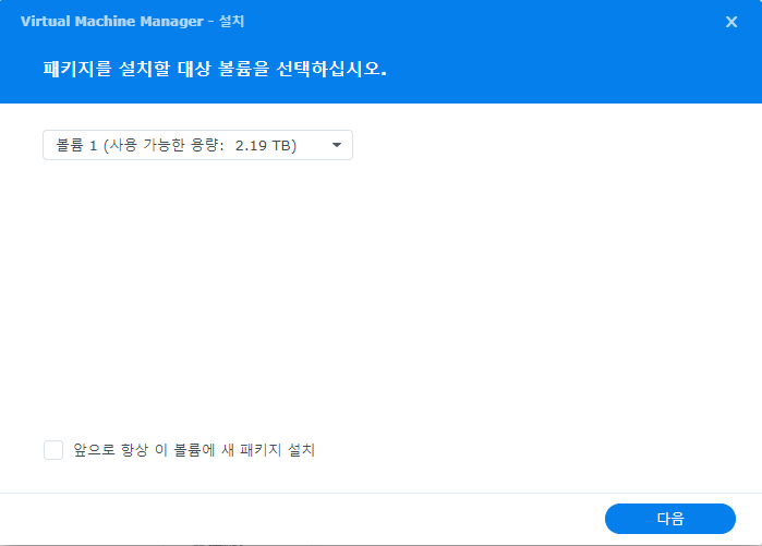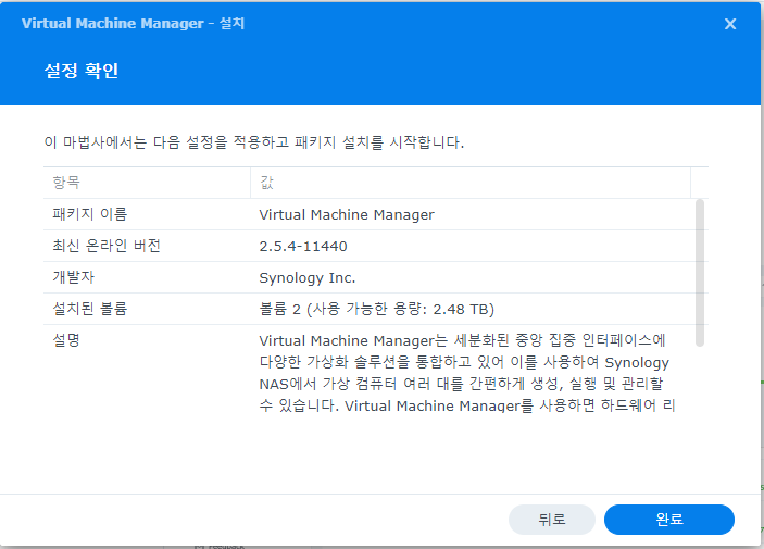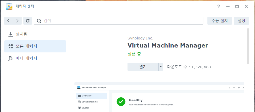 DSM에서 패키지 센터를 실행하고, 모든 패키지에서 Virtual Machine Manager를 검색한다.