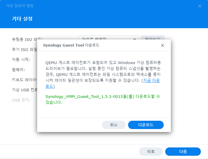가상 컴퓨터의 드라이버 설치에 사용되는 Synology Guest Tool 다운로드 창이 활성화 되는데 다운로드 버튼을 눌러준다.