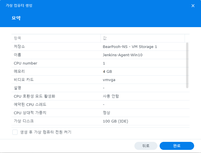 현재까지 선택한 옵션들에 대한 요약 정보가 표시된다. 이상이 없으면 완료를 클릭한다.