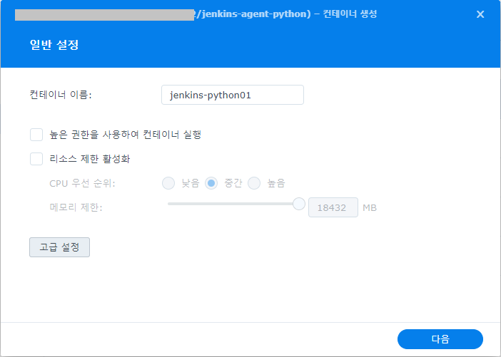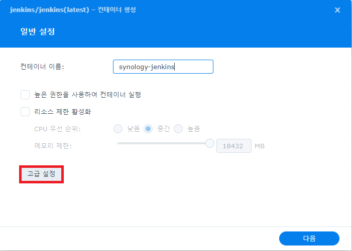 컨테이너 이름을 지정하고 고급 설정을 클릭한다.