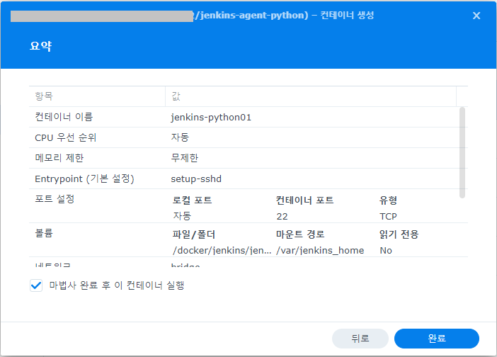 설정 값들을 확인하고 이상 없으면 완료를 클릭한다.