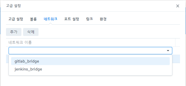 네트워크 탭을 클릭하고 네트워크 이름에서 jenkins_bridge를 선택한다.
