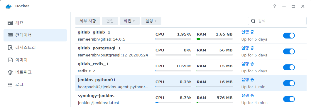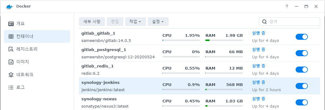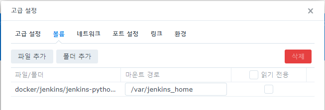 컨테이너 탭에서 synology-jenkins 컨테이너를 더블클릭한다.