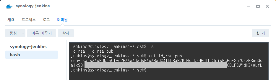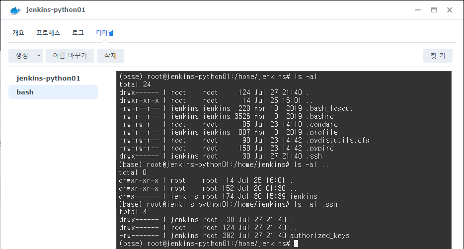 컨테이너 내부의 /home/jenkins/.ssh 경로에 authorized_keys 파일이 자동으로 생성된다.