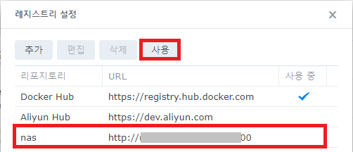 해당 이미지를 배포한 사설 저장소를 선택하고 상단의 사용을 클릭한다.